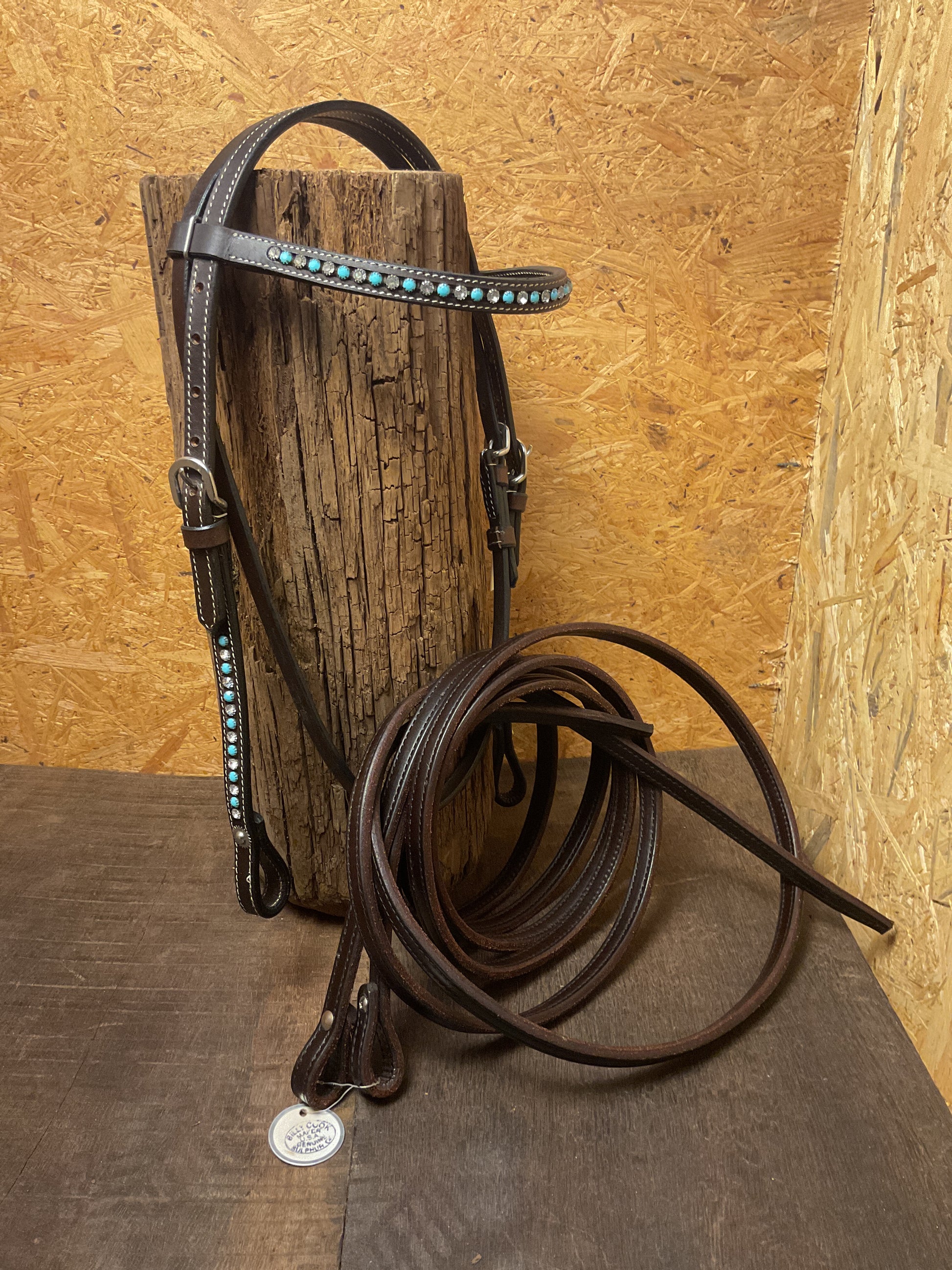 Tolles Kopfstück in dunkelbraun mit kleinen klaren und türkisfarbenen Straßsteinen.