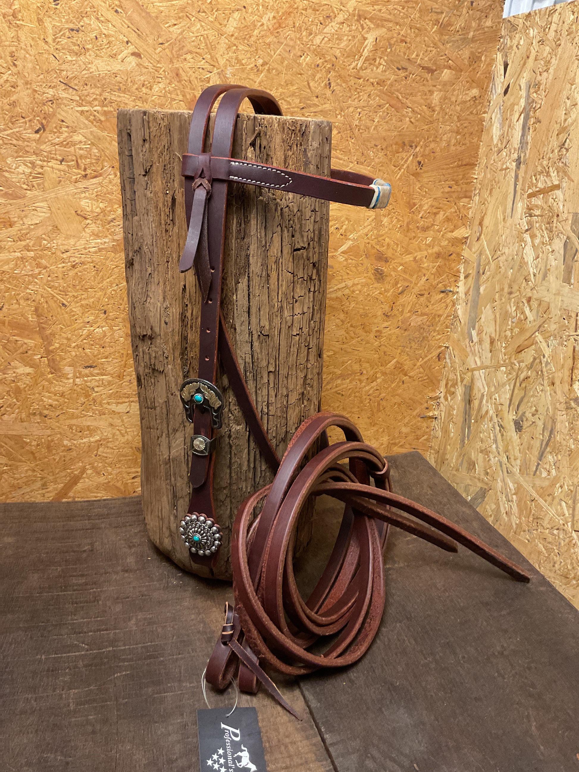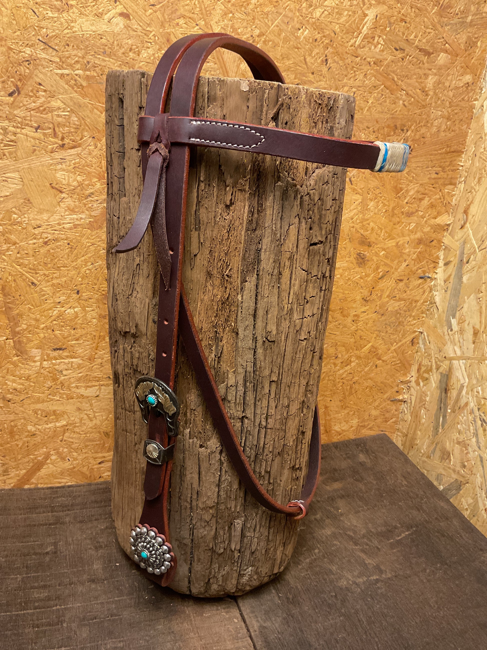 Einzigartiges Kopfstück mit Türkis gehitchter Rohhaut und auffälligen Schmuckschnallen und Conchos mit Türkisen Steinen.