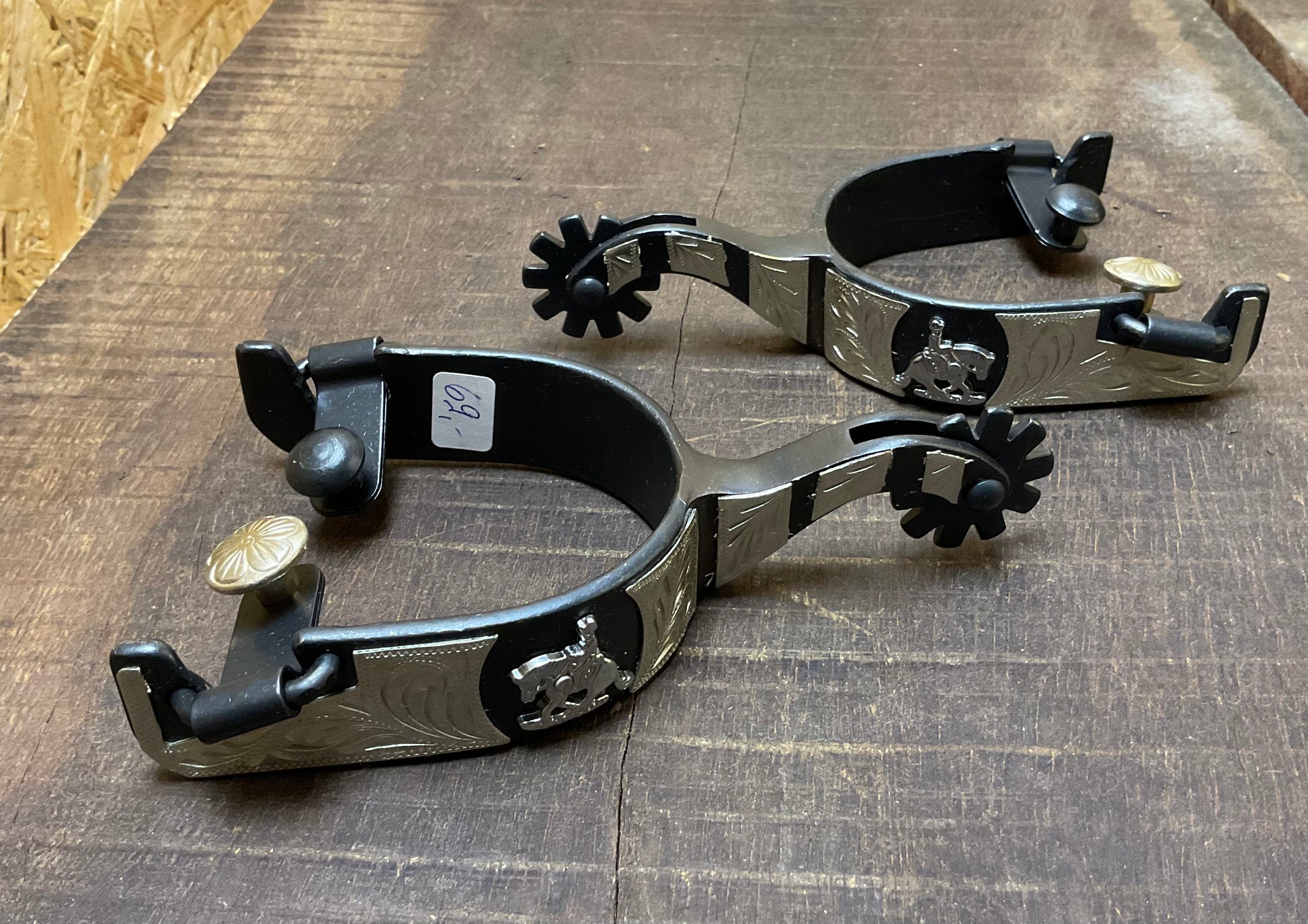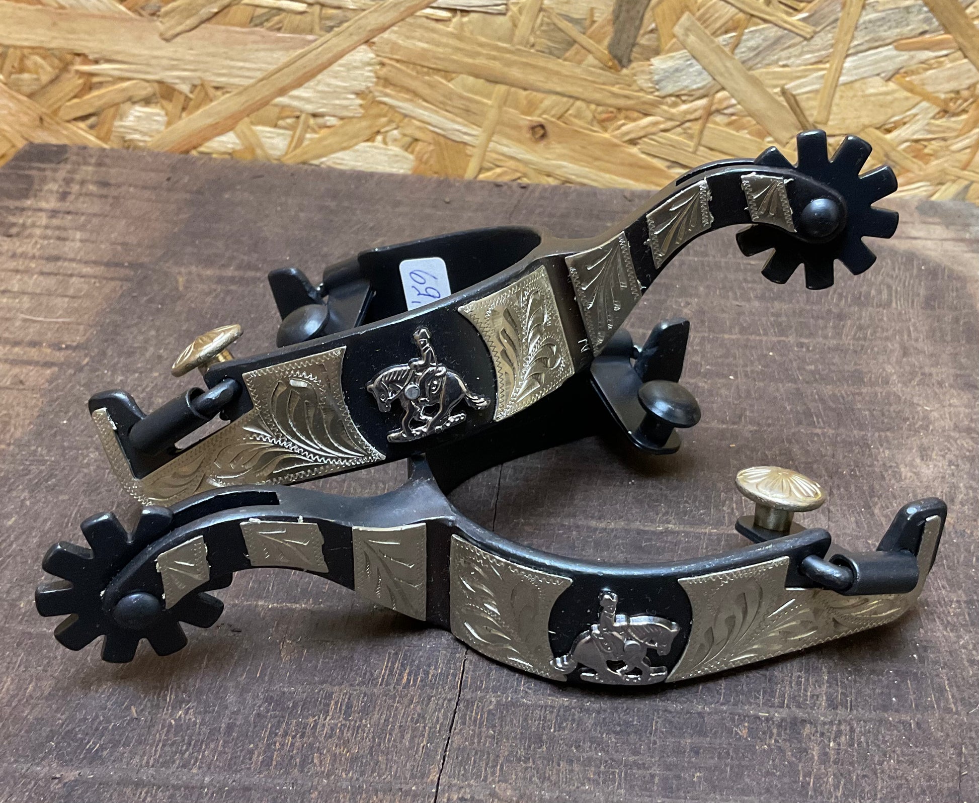 Toller schwarz antiker Sporen mit Silber gravierten Reinigmotiv.
