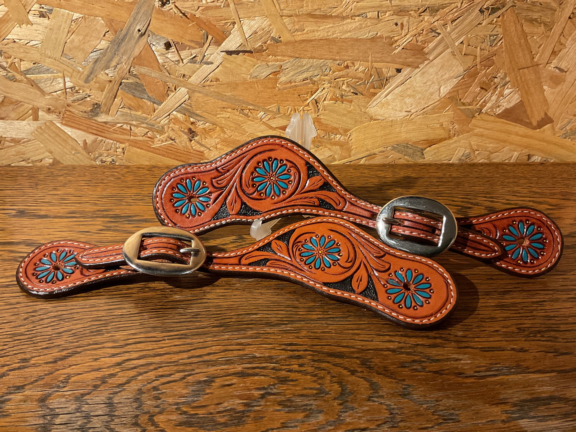 Tolle Sporenriemen aus Leder mit einer aufwendigen Floral Punzierung mit Türkies gearbeiteten Details.