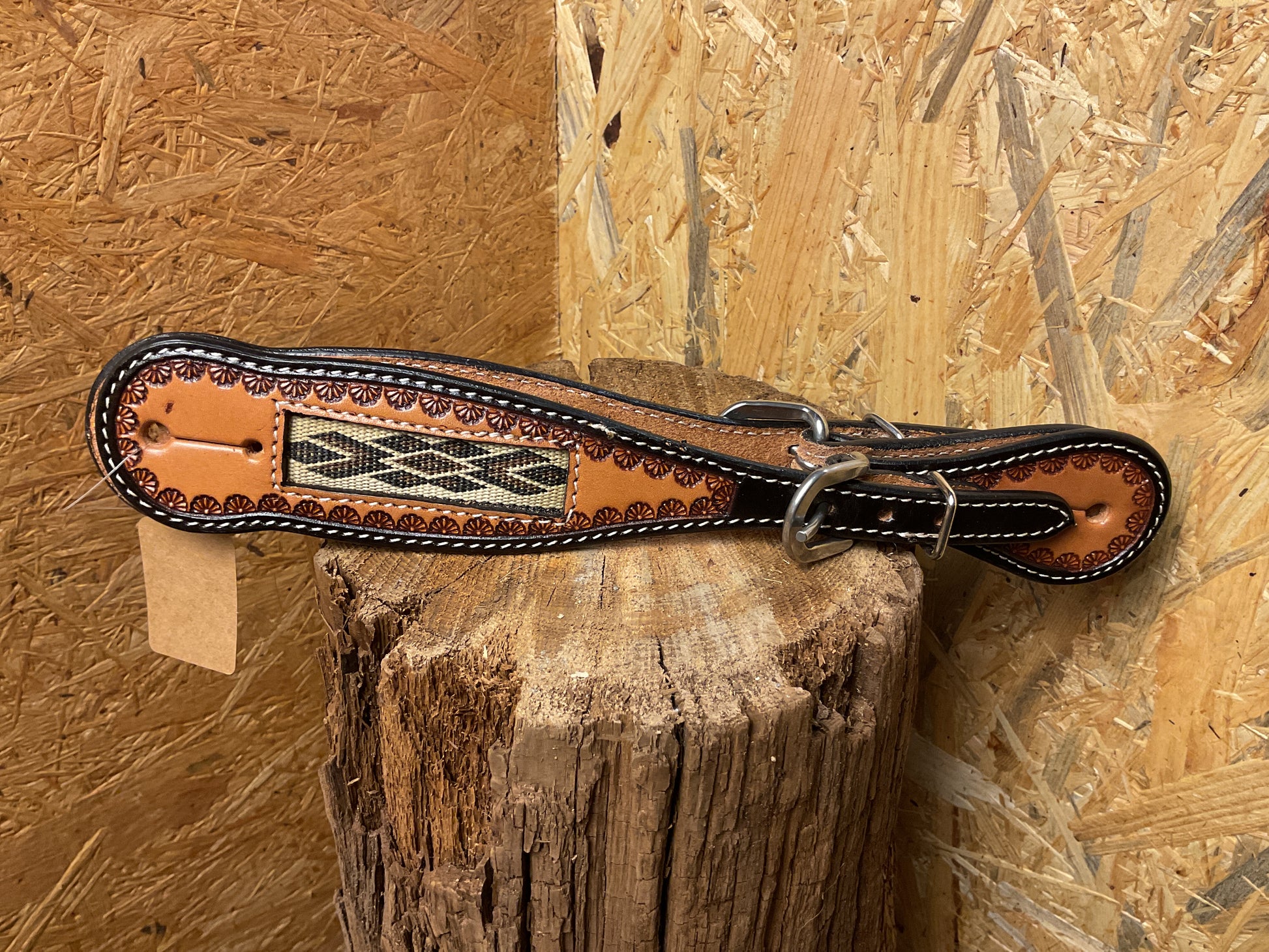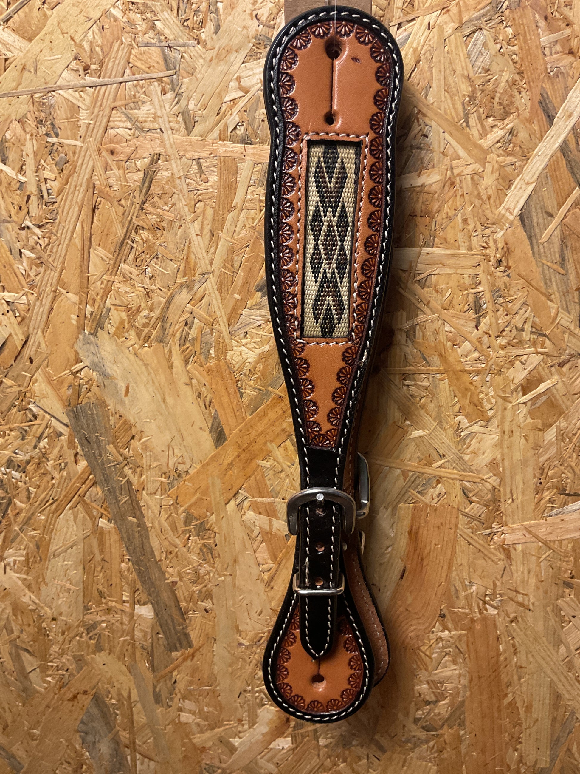 Tolle Sporenriemen mit gehitchtem Inlay in Naturfarbenen Muster. Das Leder ist 2 farbig gearbeitet mit dezentem Bordertooling.