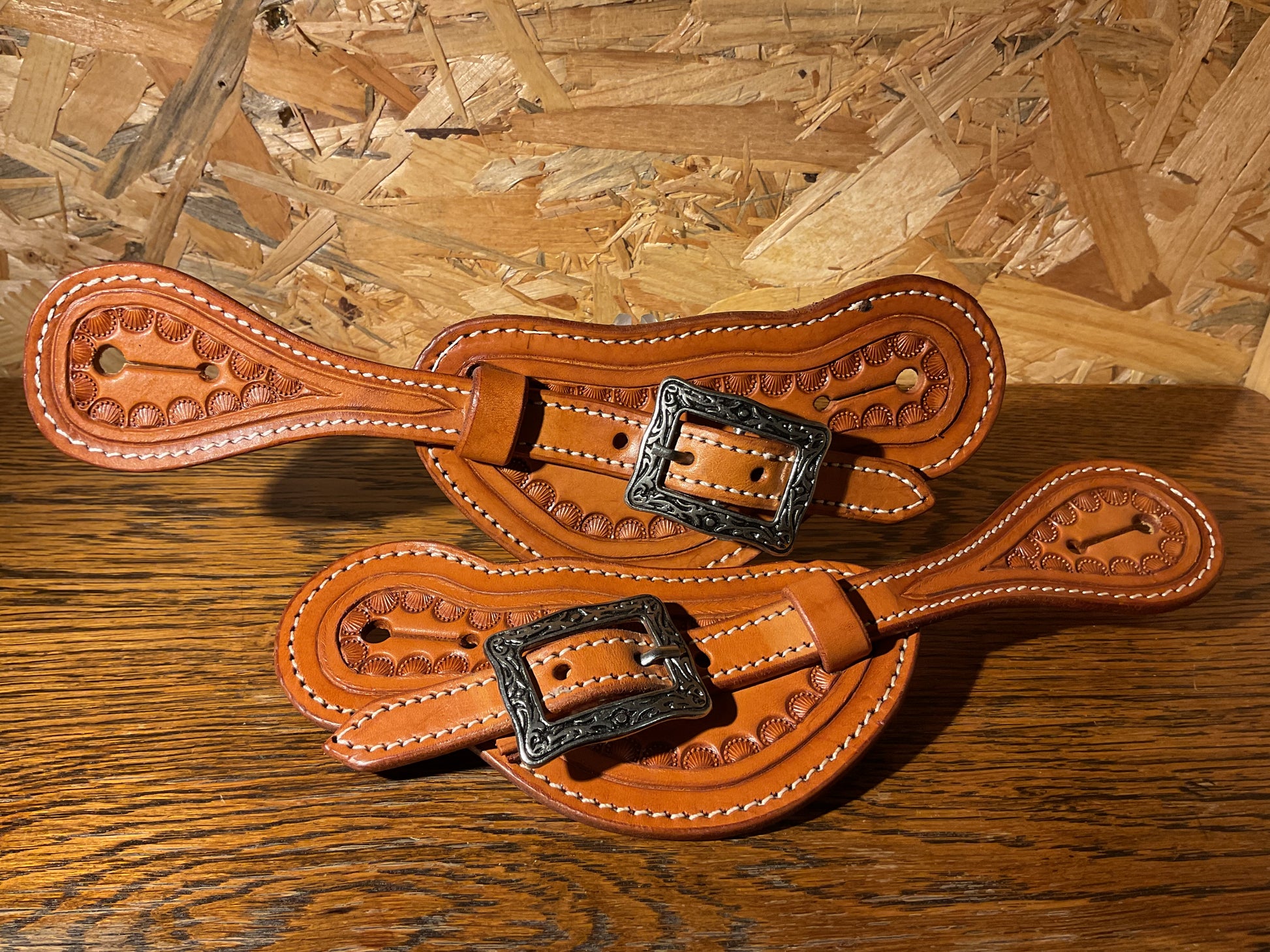 Schöne Sporenriemen mit einem netten Bordertooling und einer 2 farbigen, eckigen Schmuckschnalle.