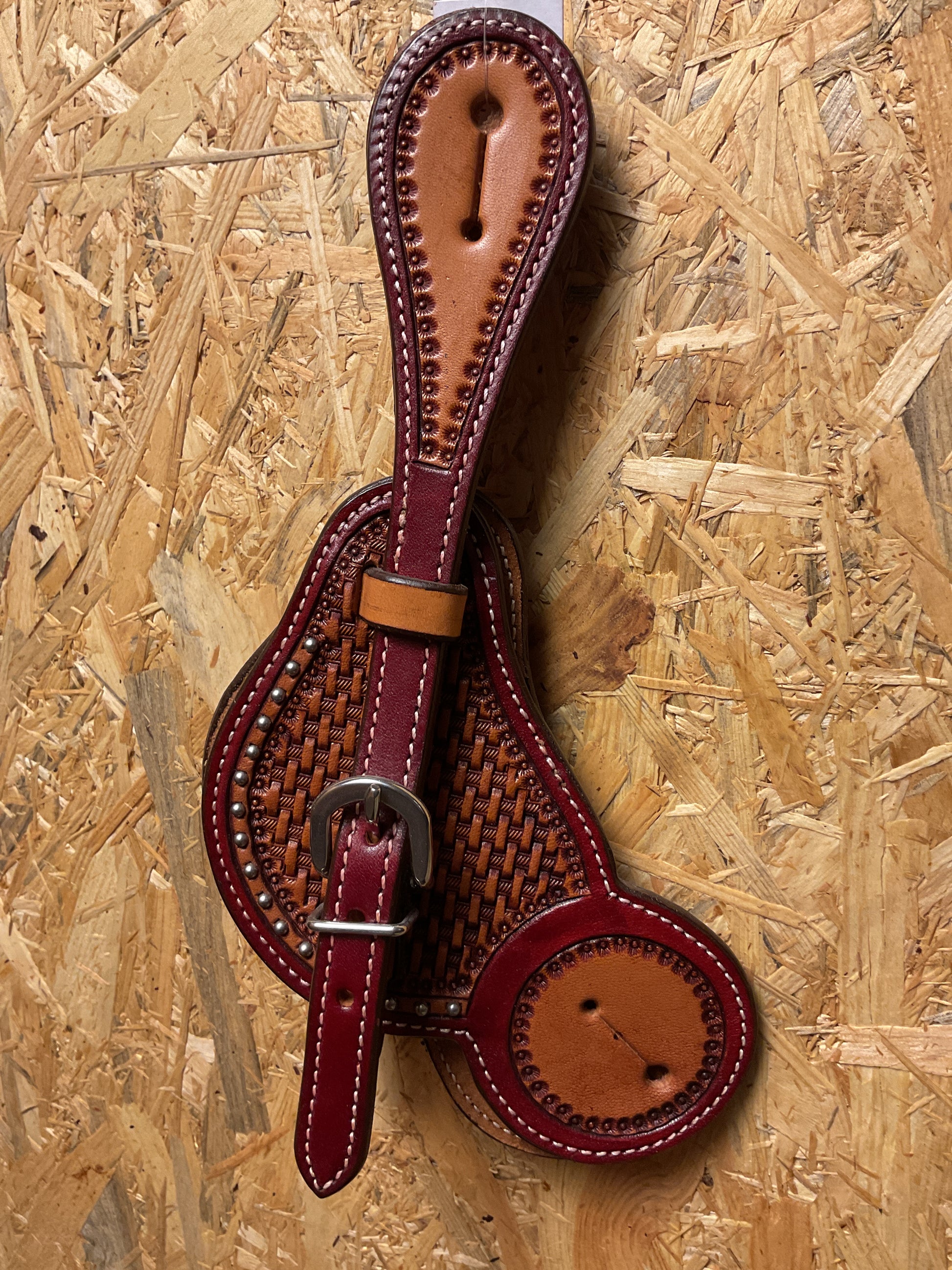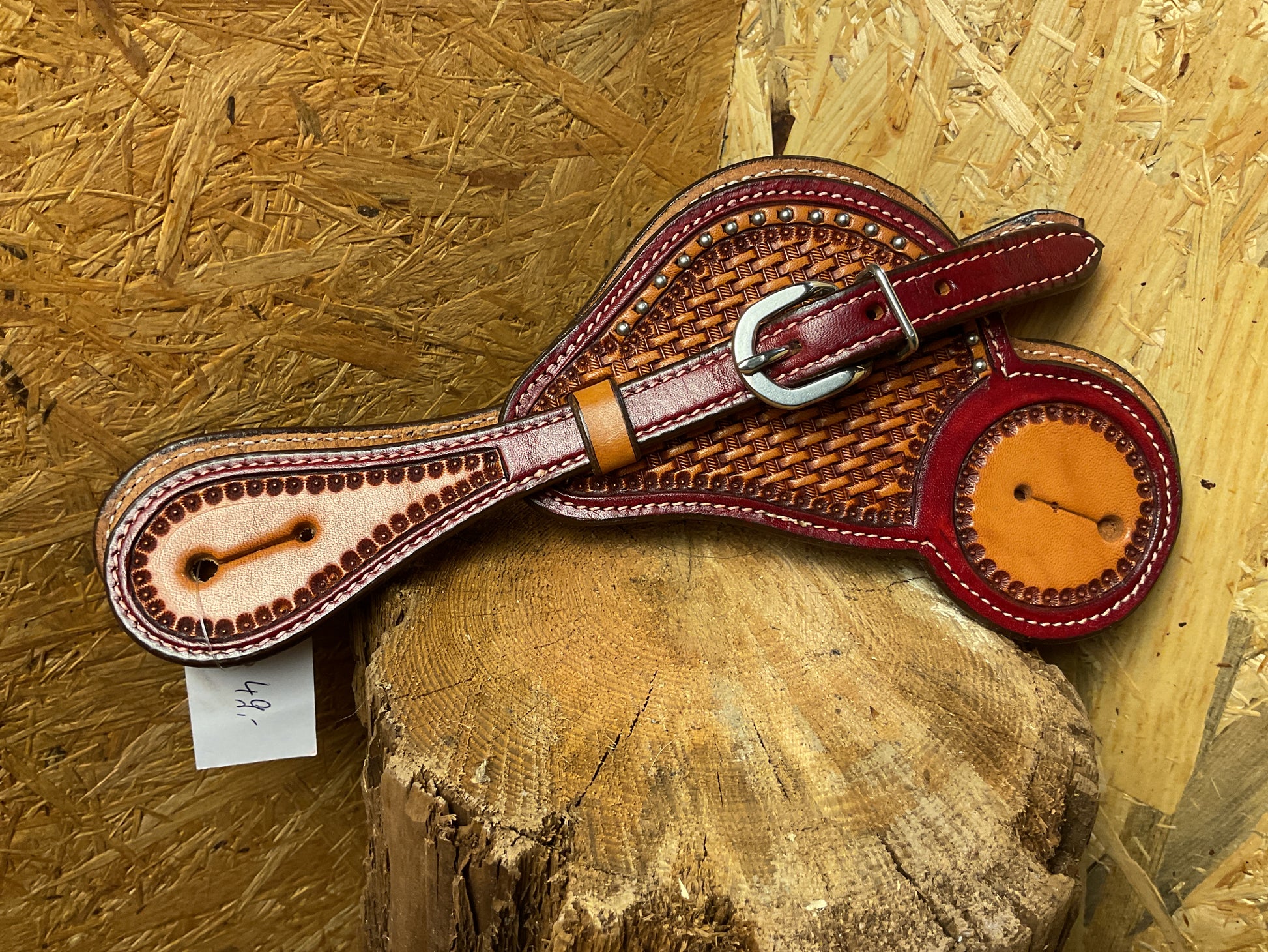 Tolle Herren Sporenriemen, 2 farbig in TAN und Rotbraun mit Basket-Muster punziert und kleinen Dots.
